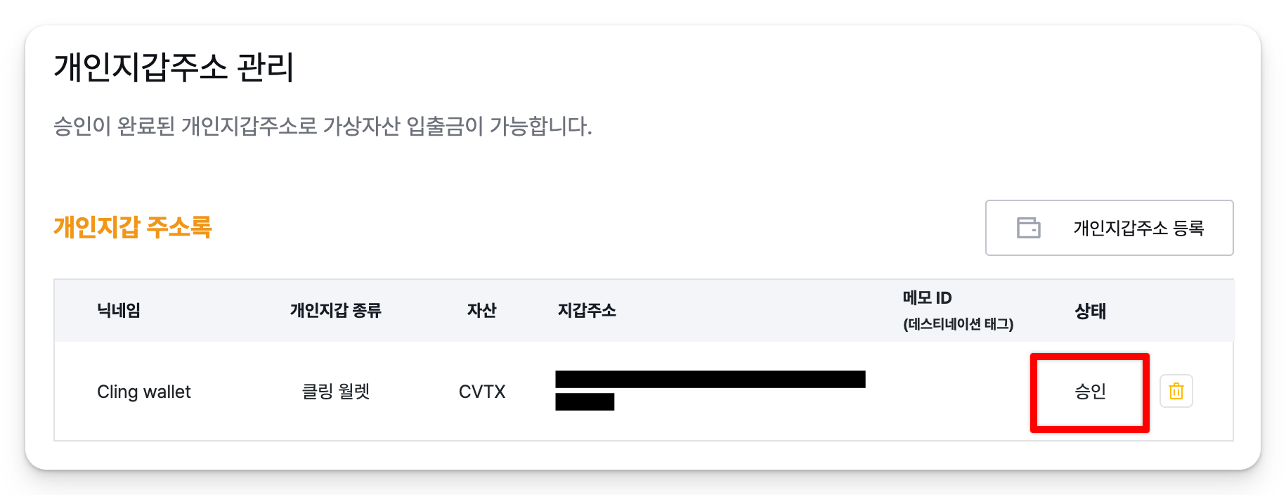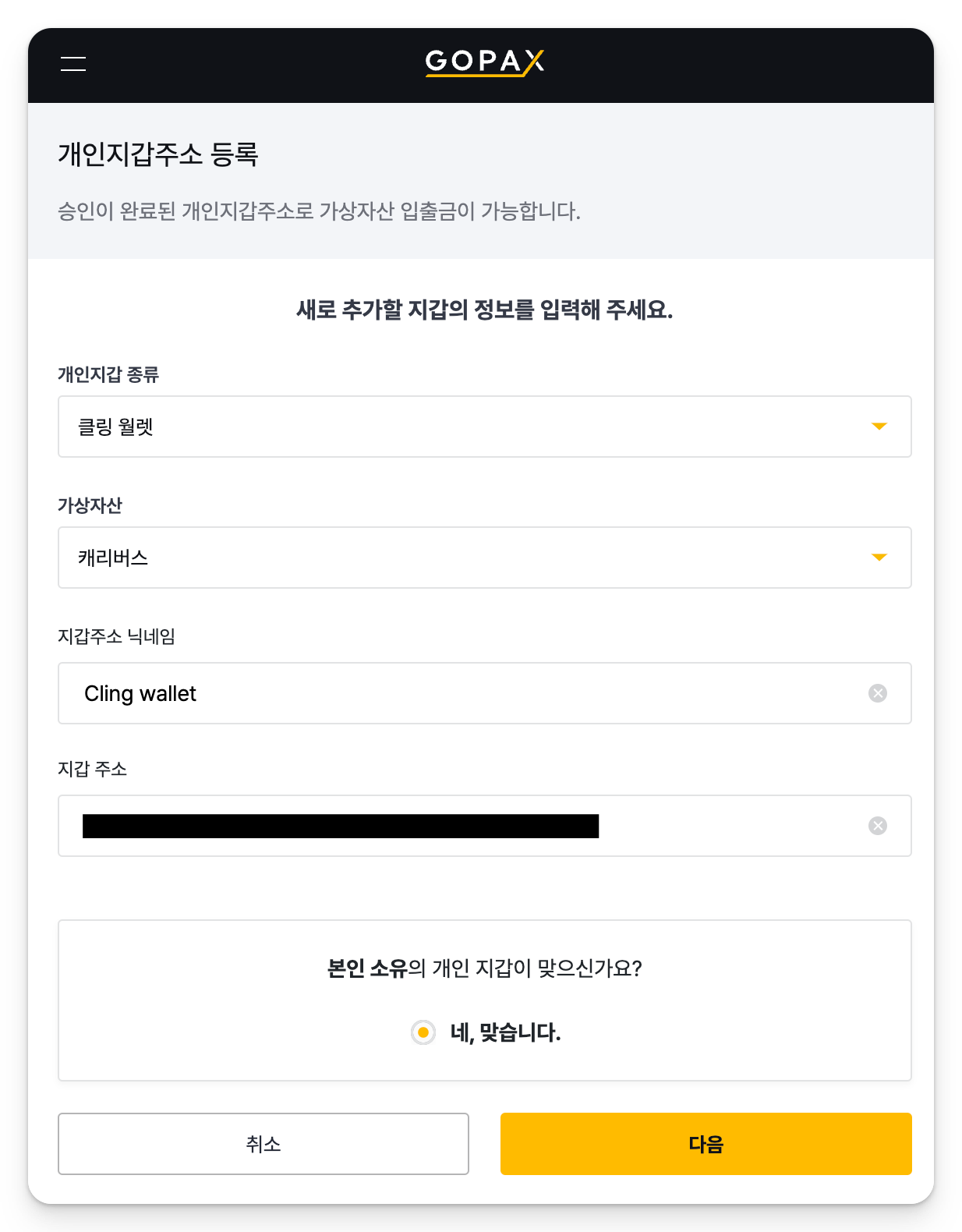 고팍스에 Cling 지갑 등록하기