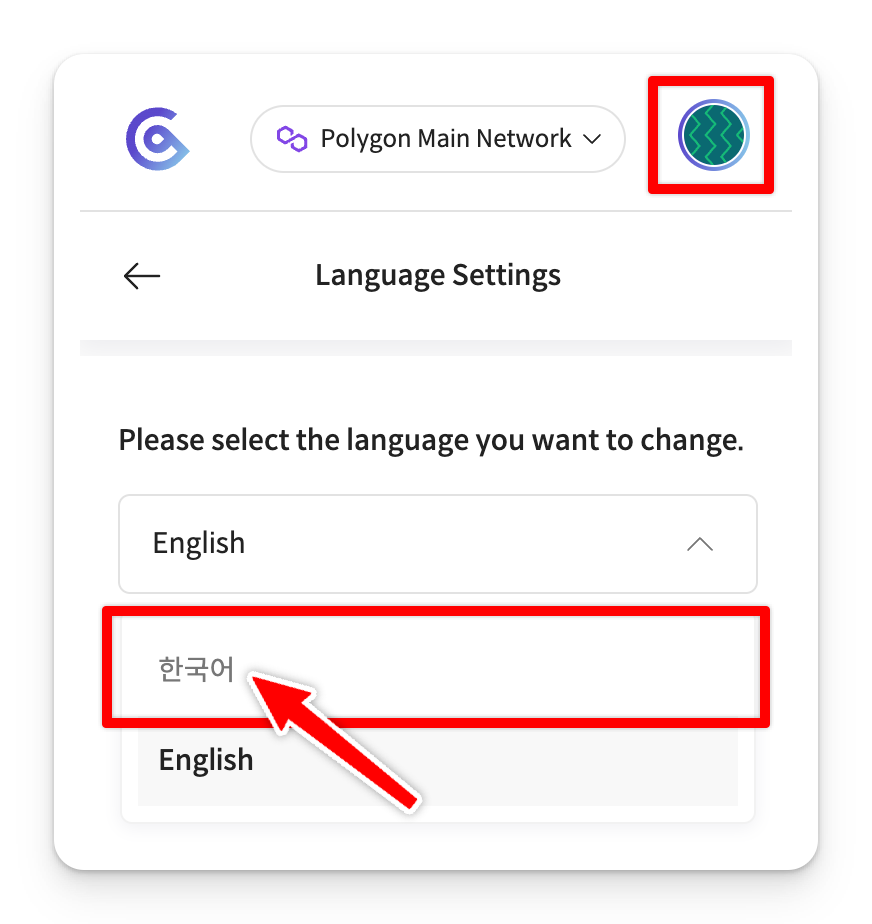 우측 상단 아이콘을 누른 후, [Setting] > [ Language Settings ] 메뉴에 들어가면